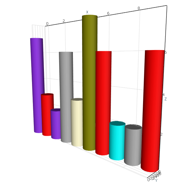 //Define mesh var barMesh = CylinderMeshFactory.CreateCylinder(20); var myColors = new[] { Colors.Red, Colors.Aqua, Colors.DarkGray, Colors.Olive, Colors.BlueViolet, Colors.LemonChiffon }; //Configure transform Matrix4F Transform(float x, float value) { return Matrix4F.Scaling(0.9f, 0.9f, 1) * Matrix4F.Translation(x % 10, x / 10, 0.5f) * Matrix4F.Scaling(1, 1, value); } //Generate some random data var random = new Random(); var values = Enumerable.Range(0, 10).Select(x => new { X = x, Value = random.Next(10) }); var colors = Enumerable.Range(0, 10).Select(x => myColors[random.Next(myColors.Length)]).ToArray(); //Add all into data collection var bars = new MultiColorPrimitiveCollection { Mesh = barMesh }; bars.SetTransformsAndColor(values.Select(v => Transform(v.X, v.Value)).ToArray(), colors); ChartControl.DataSource = bars;